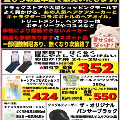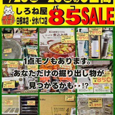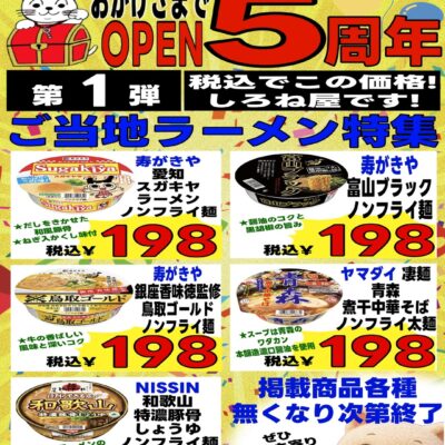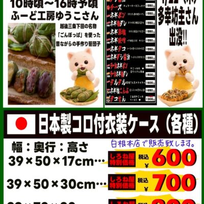 しろね屋は毎日がお買い得!お宝探し感覚でお買い物が出来るディスカウントストアです。 食品、日用品、キッチン用品、衣料品、寝具、雑貨、靴、花、園芸用品、工具、ペット用品、工芸品など色々取り揃えております。 他にも地元農家さんご協力のもと、新鮮な野菜や果物などの販売をしております。 期間限定でイベントも実施しており、キッチンカーや屋台なども当店駐車場にて販売しに来られます。 只今、LINE 公式アカウントにてLINE友達募集しています!新規友達登録でお得なプレゼントがありますので是非この機会にお友達登録よろしくお願い致します。